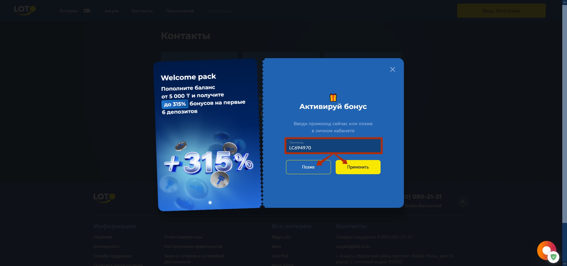 активирует LOTO SZ промокод – специальный набор символов, который